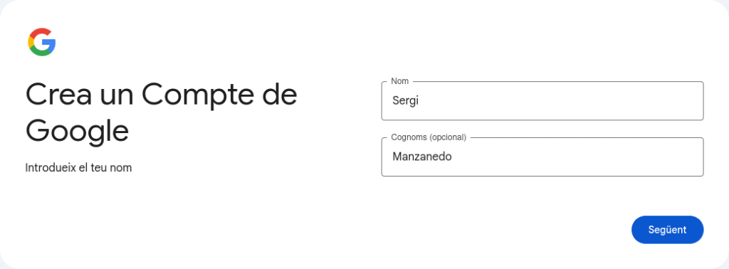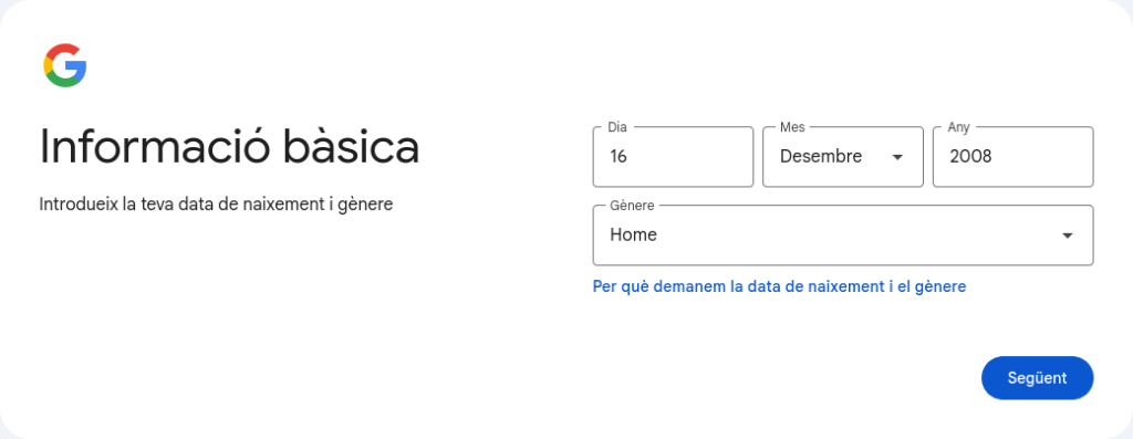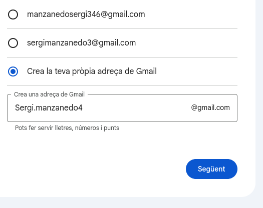 El primer pas es donar-li a “Create an account” després posem nom i cognoms Posem la nostra data de naixement Li donem a l’ultima opció i creem la nostra direcció de gmail